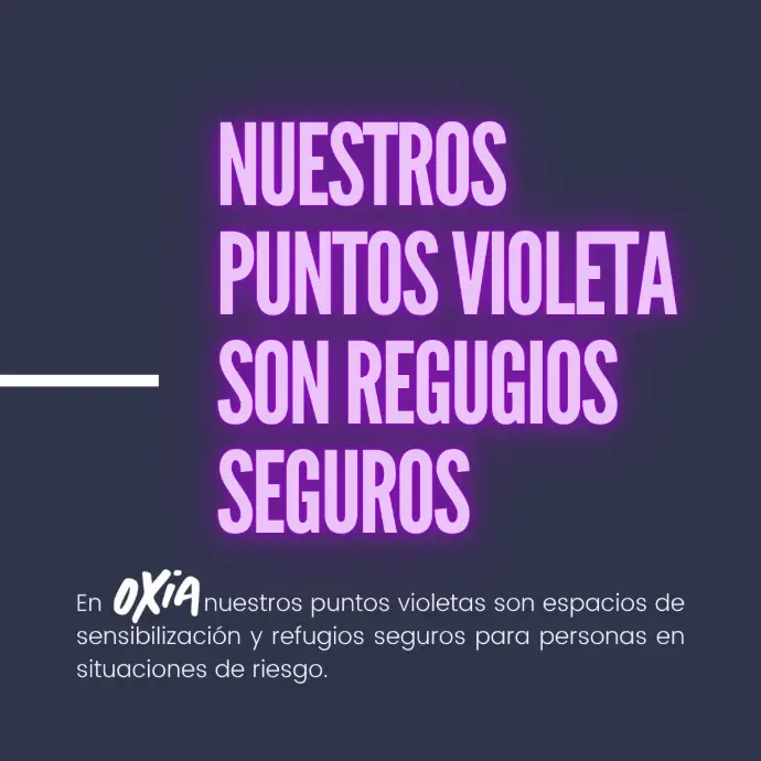 El Punto Violeta OXiA es más que un espacio de atención, es un lugar de sensibilización activa y refugios seguros en situaciones de riesgo. Nos diferenciamos de otros puntos violeta al contar con un equipo de psicólogos y profesionales entrenados en primeros auxilios psicológicos, activación de recursos y acompañamiento psicológico, ofreciendo protocolos de actuación especializados. Los Punto Violeta OXiA no solo brindan intervención y protección, sino confianza y resguardo real para quienes más lo necesitan, reflejando nuestro compromiso con la seguridad, la prevención y el bienestar integral de las personas en contextos vulnerables.